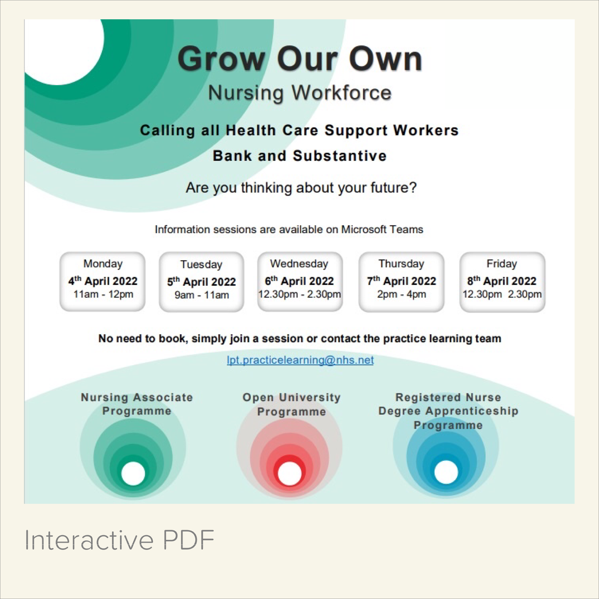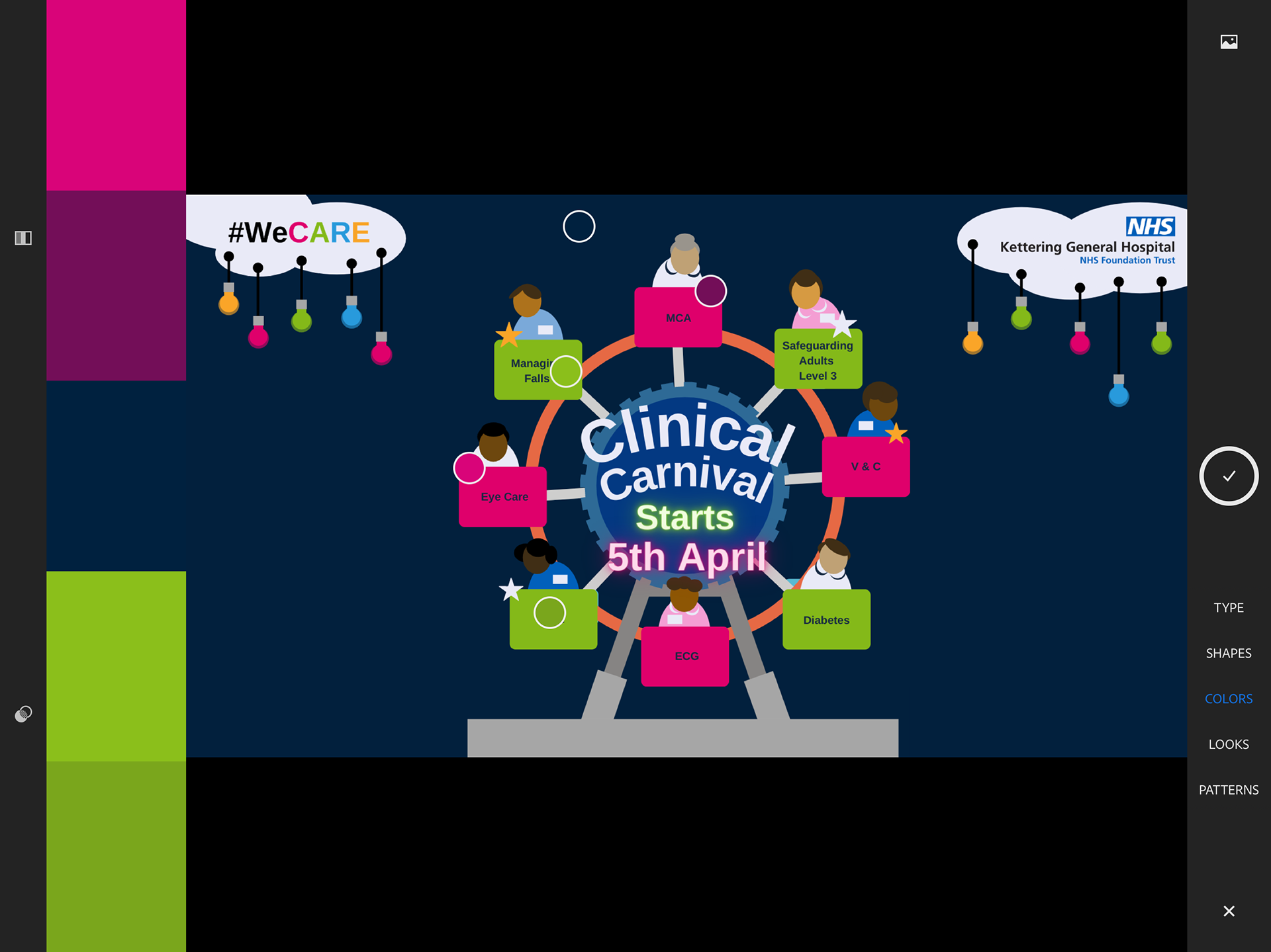 The promotional materials were designed for distribution on various channels including hospital and ward HD TV screens, PC Desktop savers, internal email as footer banners, interactive PDF flyers, Twitter and Facebook, the trusts intranet and as part of the online teams channel training event.